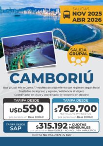 Adicional puntos de embarque desde Rafaela, Esperanza, Sunchales, Freyre, Porteña, Suardi, Morteros, San Guillermo, Brinkmann, Humboldt, Recreo $39.700 o 37U$D (dólar billete). (Consultar fechas posibles)